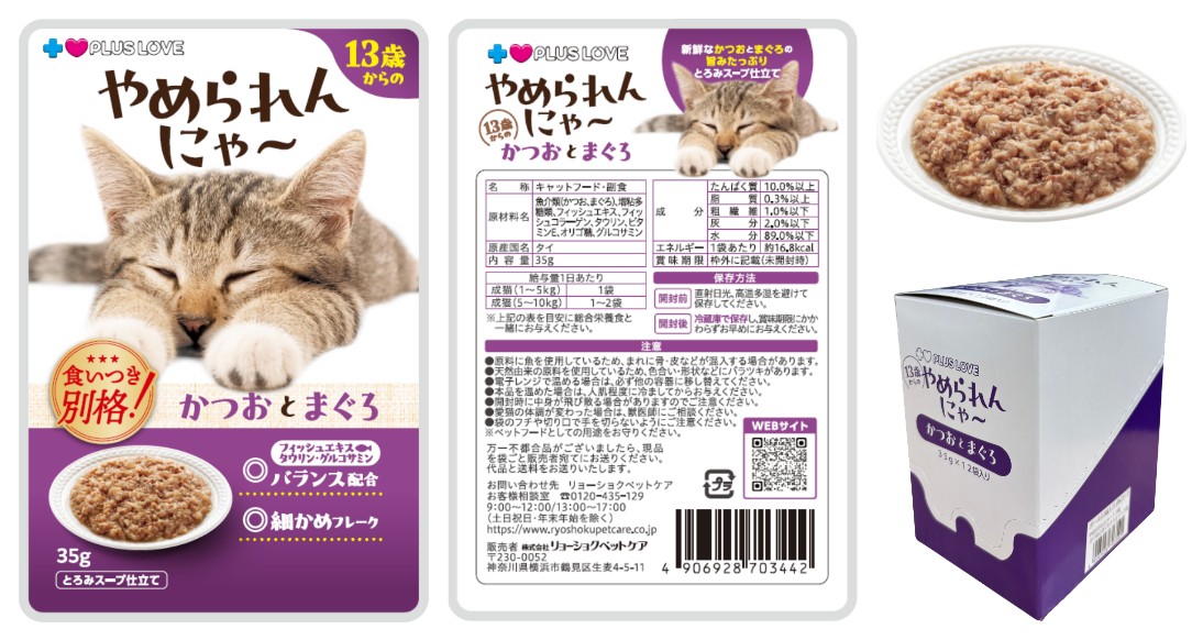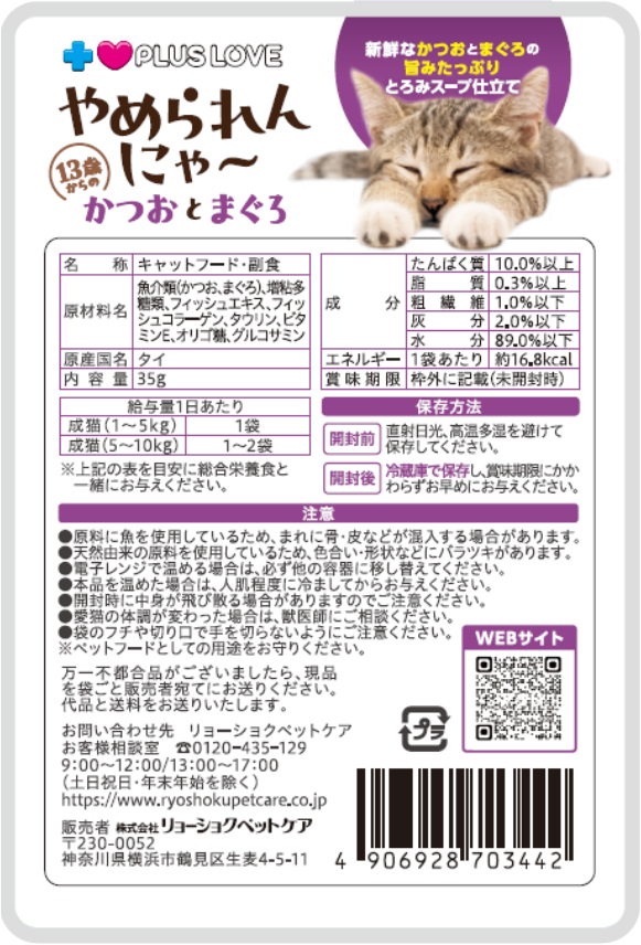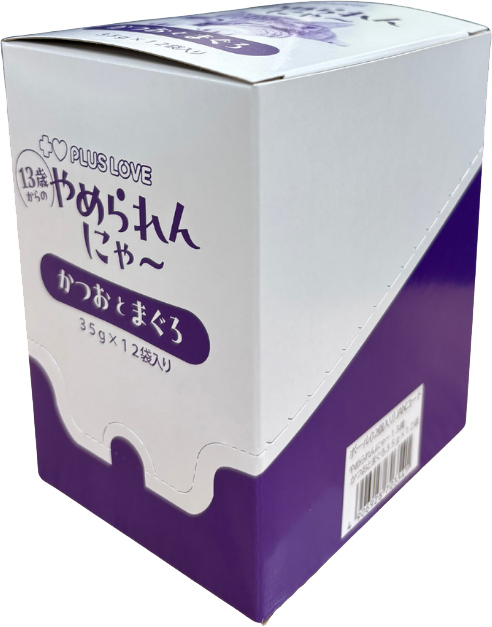| 商品名 | プラスラブ やめられんにゃ~ かつおとまぐろ 13歳からのとろみスープ仕立て 35g |